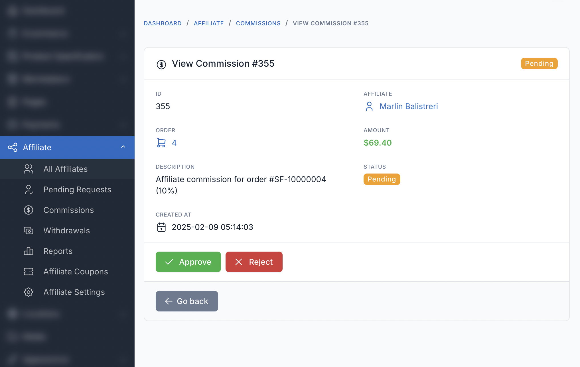 Approve/reject affiliates, manage commissions, view reports, and handle withdrawals from admin panel.
