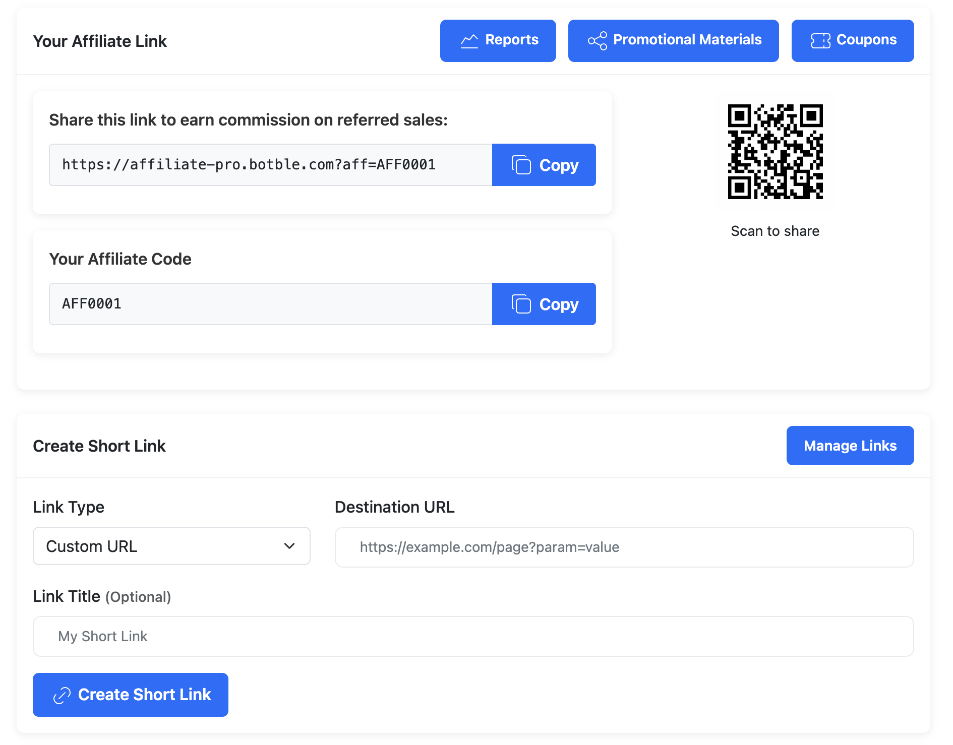 Comprehensive dashboard for affiliates to track performance, earnings, and manage their referral links.